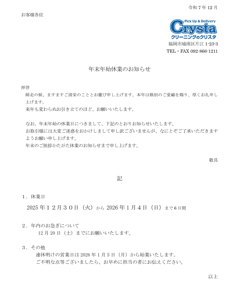 ■■□―――――――――――――――――――□■■ クリーニングのクリスタ 【住所…